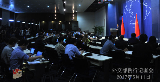 2017年5月11日外交部例行记者会 问:今天习近平主席与韩国总统文在寅通了电话,请问这是否意味着两国关系出现了改善的迹象? 答:今天,国家主席习近平同韩国总统文在寅通了电话。中方已经发了消息稿。 通话中,习近平主席祝贺文在寅当选韩国总统并指出,中韩两国是近邻,建交25年来,中韩关系发展取得很大成就,双方应该牢记中韩两国建交的初心,相互尊重彼此重大关切和正当利益,努力求同化异,妥善处理分歧。实现中韩关系更好发展,符合我们两国人民共同利益,也有利于地区和平、稳定、发展。 文在寅总统表示,韩方高度重视韩中关系,愿同中方共同努力,使双边关系高水平发展,并推进务实的战略合作伙伴关系。韩方赞赏中方“一带一路”倡议,期待着“一带一路”建设为包括中国和韩国在内的沿线国家和地区带来发展繁荣。 这里我想强调的是,中方愿同韩方共同努力,推动两国关系早日回到健康平稳发展的轨道。 问:今天,韩中两国元首在通话中提到了元首会晤,通话中是否具体讨论了会晤的日程? 答:两国元首在通话中同意保持联系,并期待着早日会面。 问:据报道,菲律宾总统杜特尔特称,他已经任命参院外委会主席卡亚塔诺为新任外长。中方对此有何评论?对与卡亚塔诺外长共同发展中菲关系有何期待? 答:去年以来,在两国元首的关心和指导下,中菲关系实现全面改善,两国合作进入新阶段,各领域合作全面恢复并取得丰硕成果,中菲关系在各个方向全面向好发展。 我们祝贺并欢迎卡亚塔诺先生出任菲律宾外长,中方愿同他一道,落实好两国高层共识,继续深化务实合作,推动中菲关系持续深入发展,造福两国人民,促进地区和平稳定。 问:据报道,有29个国家的元首和政府首脑参加“一带一路”国际合作高峰论坛,比之前公布的情况多了一个国家。你能否介绍最近确认与会的是哪一个国家的元首? 答:吉尔吉斯斯坦。 问:俄罗斯驻华大使表示,习近平主席将于7月初对俄罗斯进行访问,你能否证实? 答:你应该知道,中俄两国元首之间一直有着非常密切的交往。关于中国国家主席对俄罗斯的访问,我们会适时发布消息。  2017年5月11日外交部例行记者会 问:在老挝从事香蕉种植的中国企业因过度使用化肥而被当地禁止开辟新的种植园。中老两国政府是否就此沟通?在“一带一路”背景下,中方是否需要妥善处理类似的海外投资问题? 答:你提到的发生在老挝的这个情况我并不掌握。但是我觉得似乎没有必要把这个非常具体的个案跟“一带一路”联系得这么紧密,有点牵强。 作为原则,我们一向要求中国企业在海外投资经营时要遵守当地法律法规,履行社会责任,并注意保护当地环境。同时,我们也希望中国企业的合法权益能得到有效保障。 问:俄罗斯总统普京将来华出席“一带一路”国际合作高峰论坛。中方对此访有何期待?双方将就哪些问题交换意见? 答:俄罗斯总统普京将应邀出席“一带一路”国际合作高峰论坛。俄方很早就对“一带一路”倡议表示了欢迎和支持。事实上,两国一直就此倡议保持着非常好的沟通协调,进行了紧密合作。 据我了解,普京总统与会期间将会与习近平主席举行会谈,届时双方将就双边关系以及共同关心的重大国际和地区问题深入交换看法。 正如我刚才回答你的同事时所说的,中俄两国领导人有着非常密切的交往,双方经常性的会晤对深化中俄全面战略协作伙伴关系有着非常重要的意义。 问:“一带一路”国际合作高峰论坛即将召开,外界都很关心,你能否介绍一下筹备工作的最新进展? 答:今天上午,“一带一路”国际合作高峰论坛筹委会秘书长、外交部副部长李保东接受了媒体采访并对论坛筹备情况做了介绍。他的核心信息就是:一切就绪!We are ready! 目前,29位外国元首、政府首脑及联合国秘书长等3位重要国际组织负责人将出席领导人圆桌峰会等活动。来自130多个国家的约1,500名各界贵宾将作为正式代表出席。来自全球的4,000余名记者注册报道此次论坛。可谓盛况空前! 此次论坛内容丰富,主要包括开幕式、圆桌峰会和高级别会议三个部分。5月14日上午,习近平主席将出席开幕式并发表主旨演讲,开幕式后将举行高级别全体会议,5月14日下午将举行以“五通”、智库交流为主题的6场平行主题会议;15日,习主席将主持圆桌峰会,包括两个阶段的会议和工作午餐。习主席还将在其后的记者会上介绍高峰论坛主要成果。 此外,中方将同出席圆桌峰会的有关国家共同发表一份联合公报,这份公报将反映各方在“一带一路”建设上的共识。论坛期间,与会各方还将对接发展战略,合力打造一批务实合作成果,届时将签署一系列合作文件。 总之,中方愿以此次论坛为契机,与志同道合的伙伴们一道共商合作大计,共建开放平台,共享发展成果。让我们共同期待此次论坛取得圆满成功!  2017年5月11日外交部例行记者会 问:中方将于何时发布“一带一路”国际合作高峰论坛的具体日程安排?谁将代表欧盟出席?是欧盟委员会主席还是副主席? 答:我现在只有高峰论坛的框架日程。我可以告诉你,高峰论坛的新闻中心将于5月12日到15日在国家会议中心开展工作,关于论坛的一些具体问题,新闻中心会有更详细的信息。 至于你提到欧盟方面出席论坛的情况,昨天你问过类似的问题,据我了解,欧盟方面有代表出席论坛。 追问:你知道是谁么? 答:欧盟方面有代