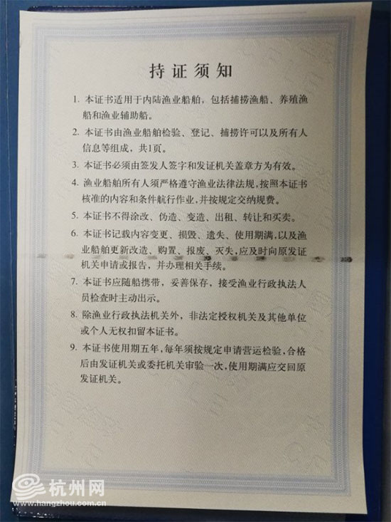 内陆渔业船舶证书持证须知