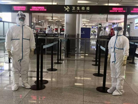 长时间的跑动和站立已经让一线关员们直不起腰,长时间身着防护服也让他们快要喘不过气来,但在卫生处理前,他们还不能脱下防护服,为了避免污染,关员们只好蹲坐在已经空旷的入境大厅隔离区内,继续向机场的负责同志汇报疑似病例的处置情况。