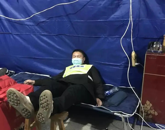 在尘土飞扬中吃下快餐;简易棚子挡不住后半夜的凉风刺骨;折叠躺椅是劳累后获得短暂休憩的最好归宿……他们是分水疫情防控的硬核执勤小组,由镇班子成员、镇平安办、派出所民警共同组成,当中大多是军人出身。