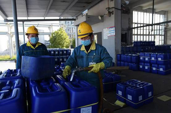 要想让生产线正常运转,保障员工生命安全是第一步。因时制宜,灵活安排生产计划又是关键一环。电化集团以生产涉水用次氯酸钠为主,主要供给自来水公司消毒用,以大包装为主,而随着疫情发展,25千克小桶包装的5%消毒次氯酸钠成为急需品。改造灌装管路、新增灌装口、制作简易分配台,电化集团连夜打造了一条小包装灌装生产线。在疫情期间,平均日产2200桶,出货量最多一天达到3000余桶。