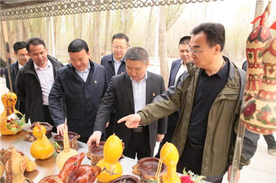 调研组一行欣赏新疆大学生彩绘作品 来到依麻木镇亚贝希村,调研组重点考察了惠鑫服饰合作社、核桃初加工厂,在得知该村工作队帮助核桃初加工产品远销国外时,朱林森对工作队的工作表示肯定和赞许。