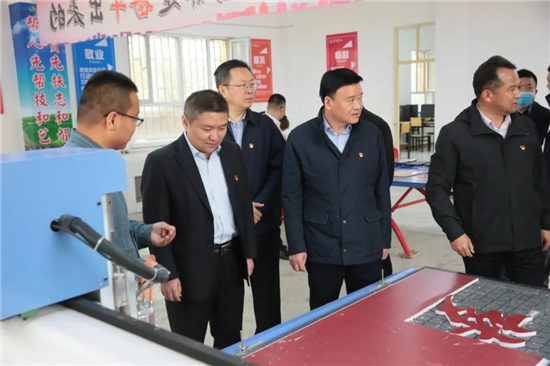 参观先锋旗帜厂车间 在阿合雅镇托万克库曲麦村,调研组先后走访了解了先锋旗帜厂、创业园、卫星工厂等项目建设运营情况。“房租费一年多少,运营的怎么样?”在创业园朱林森亲切地向创业户询问他们的经营状况,并向驻村工作队负责人详细询问村民的就业和收入。