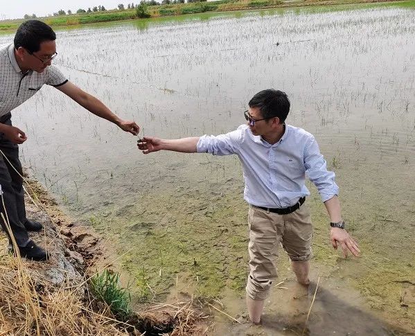 在兵团第一师二团南疆盐碱水土环境协同改良关键技术及耐盐碱水稻选育种植示范区,专家组一行查看了耐盐碱水稻的生长情况,讨论种植管理的各个要点和水资源循环利用的相关事宜。并从盐碱水渠采集水土样,系统了解新疆当地的水资源情况,对水做同位素测定及相关研究,进一步了解二团的水质分布情况。
