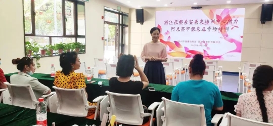 先后举办电商直播、家政服务、美容美发培训班15期、2200余人(次);全国劳模、浙江花都美容美发培训中心创始人罗红英团队在阿成立“‘杭州工匠’名师工作室”;国家级裁判员、浙江工匠、人社部教材编写专家俞世统为首期学员授课并做实操练习,累计培训女性创业者500余人。选送10名美容美发技能骨干赴杭培训获得高级工证书,参加阿克苏地区首届美容美发大赛取得优异成绩。 2 扶持巾帼创业