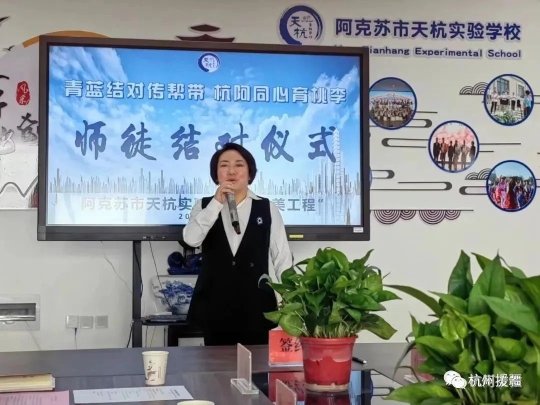 结对仪式前,阿克苏市天杭实验学校党支部书记孔朝丽致辞表达了援疆教师的感谢,希望天杭教师静下心、俯下身,向师傅虚心求教。