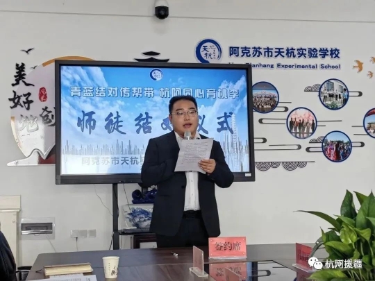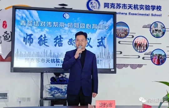 为贯彻落实第三次中央新疆工作座谈会和第八次全国对口支援新疆工作会议精神,实施援疆教师传帮带“青蓝工程”,3月11日,阿克苏市天杭实验学校援疆教师与学校部分教师举行了隆重的师徒结对仪式。