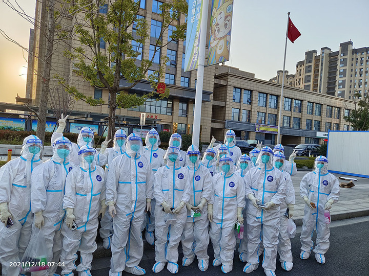 凌晨接到浙江省厅紧急通知后,浙大一院立即组建有护理、检验、院感人员参与的107人的核酸采样医疗队,由许国强副院长带队,自行安排车辆5点钟出发赶赴绍兴上虞,参加上虞核酸采样大会战。