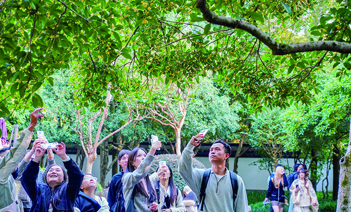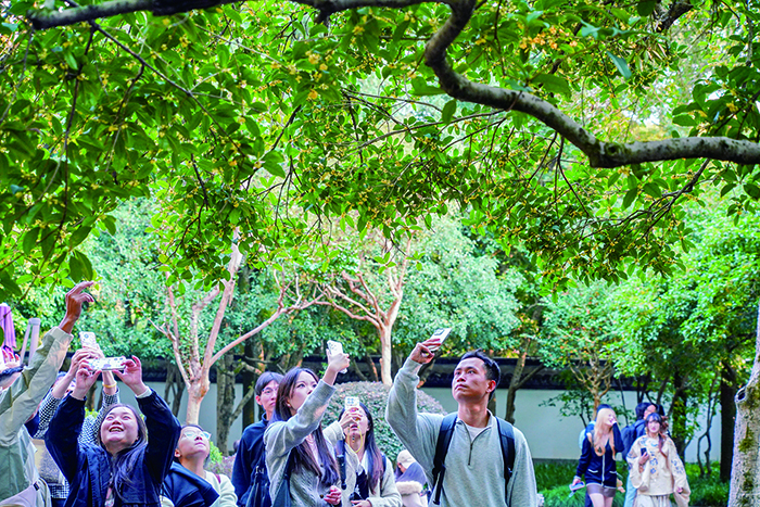 这个双休日,杭州迎来入秋以来最棒的天气,许多人选择出门赏桂,尤其是杭州赏桂胜地满觉陇,是大家争相前往打卡的首选之地。目前满觉陇的桂花整体开放度为40%左右,但是走在路上已经能闻到浓郁的桂花香。这是游客在满觉陇石屋洞赏桂拍照。