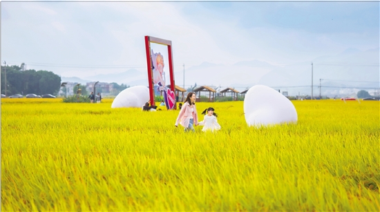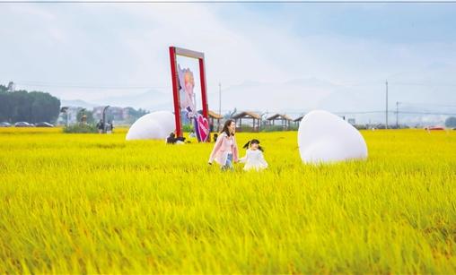 10月25日,趁着周末,人们来到杭州市余杭区径山镇前溪村开森营周边稻田游玩。当地将艺术设计融入稻田,呈现出农文旅融合新景象,为游客带来全新体验。