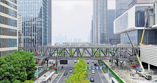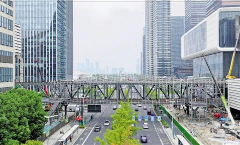 10月26日,杭州国际博览中心一期、二期双层空中连廊正在建设。杭州国际博览中心二期项目目前全面进入竣工收尾阶段,完工后,一期、二期项目将实现“珠联璧合”。