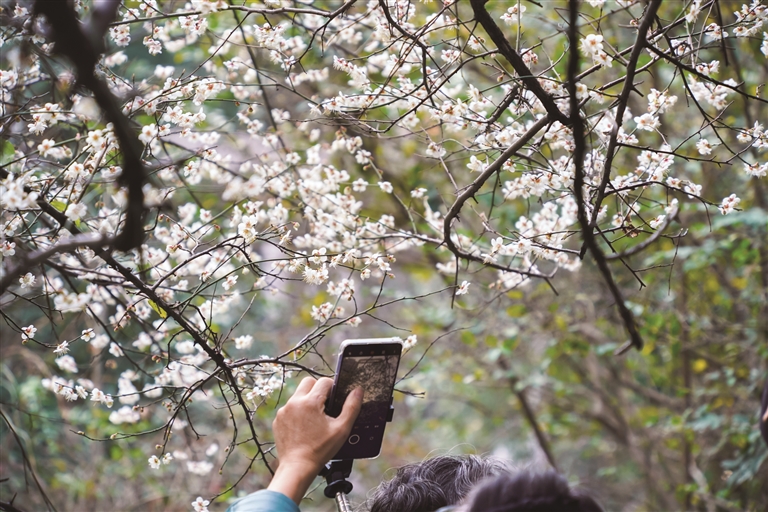 昨天,上城区凯旋公园内,一株白梅花开正盛,远看仿佛点点云絮,近看如同雪落枝头,洁白纯粹,清香阵阵,几只蜜蜂飞舞其间,构成一幅淡墨山水画,吸引不少摄影爱好者前来定格美好。