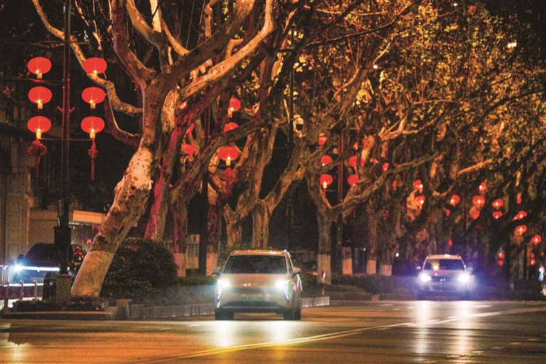 春节临近,杭城的大街小巷已陆续挂上了一串串大红灯笼,将冬日的街巷装点得暖意融融,浓郁的年味扑面而来,处处皆是新春将至的喜庆氛围。 图为昨晚杭州体育场路街景。