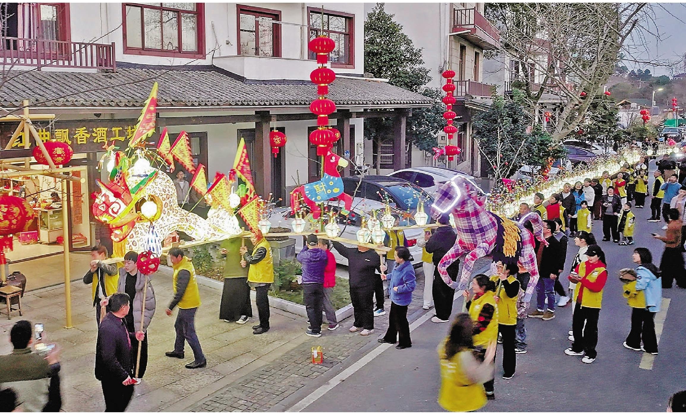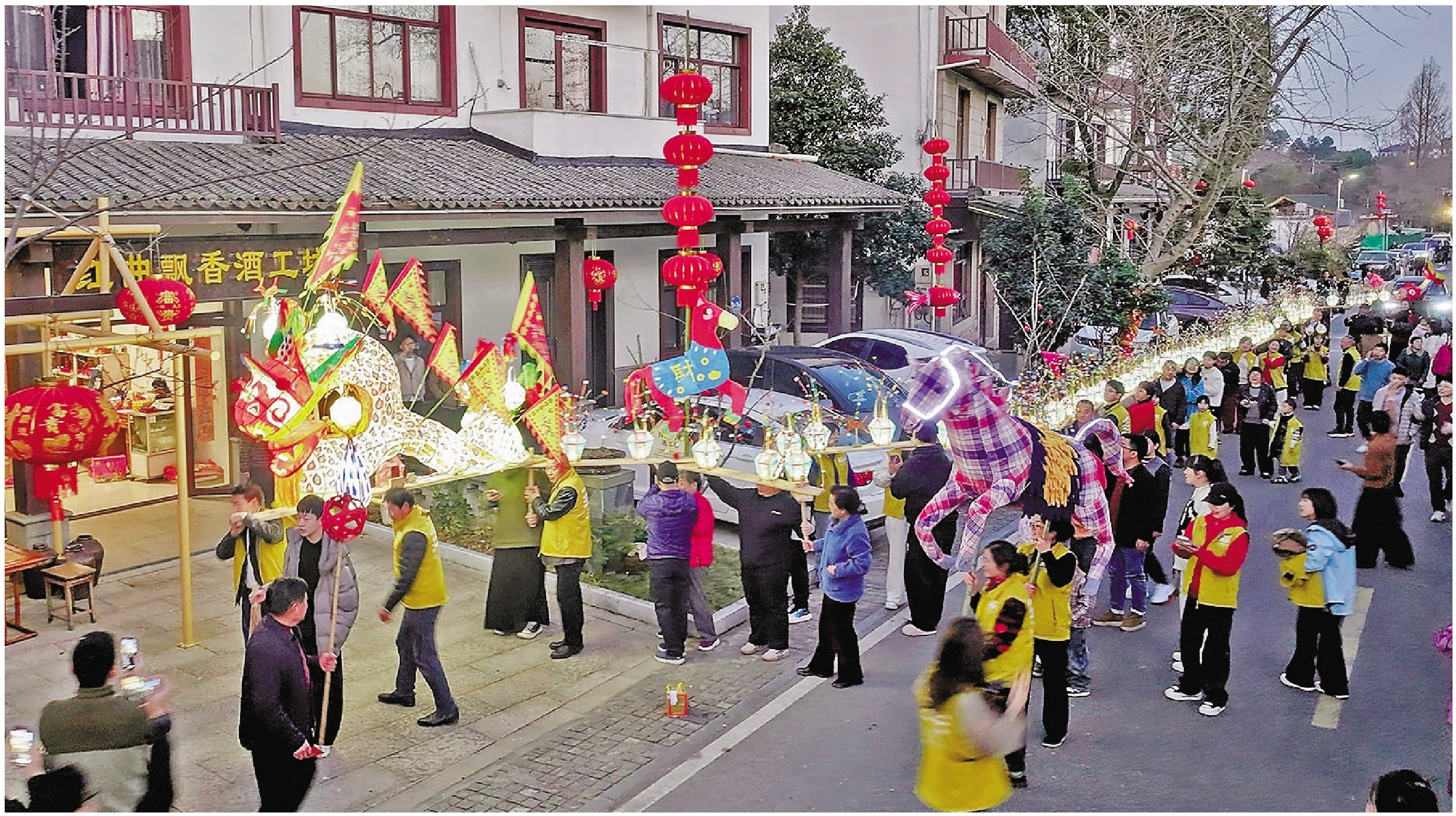 近日,余杭区百丈镇溪口村传梭博物馆举办百丈龙灯巡游活动,近百位村民代表、乡村创客、文化特派员及各地游客亲手制作一盏盏竹编花灯,安装在板凳上连接成一条长龙,巡游全村、欢闹新春。这也是溪口村依托乡村博物馆资源,创新开展“博物馆里过大年”活动的一项品牌活动。