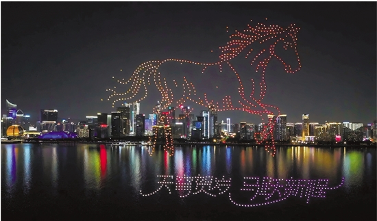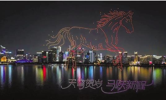 2月21日和22日晚,“天穹贺岁·马跃新程”马年春节无人机光影大秀在杭州钱江世纪公园上演。千架无人机空中列队,勾勒出天马踏云、金鬃献瑞等造型,吸引众多市民游客驻足观看。活动由浙报传媒公司等单位主办。