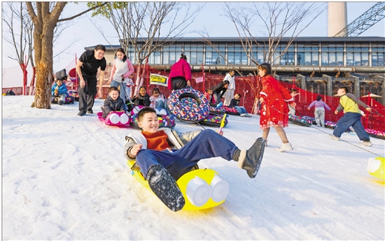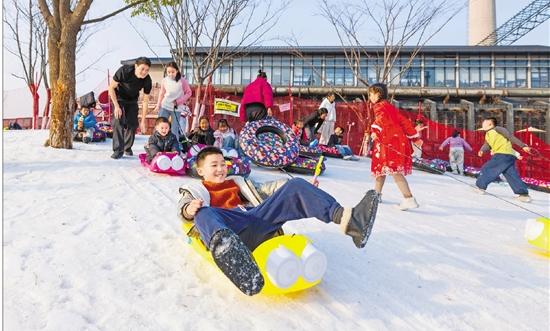 孩子们在大运河杭钢公园冰雪嘉年华玩耍。