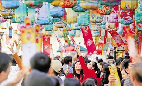 2月21日,杭州市余杭区瓶窑老街年味浓郁,市民和游客驻足观赏非遗演出、参与猜灯谜活动,沉浸在节日的喜庆氛围中。