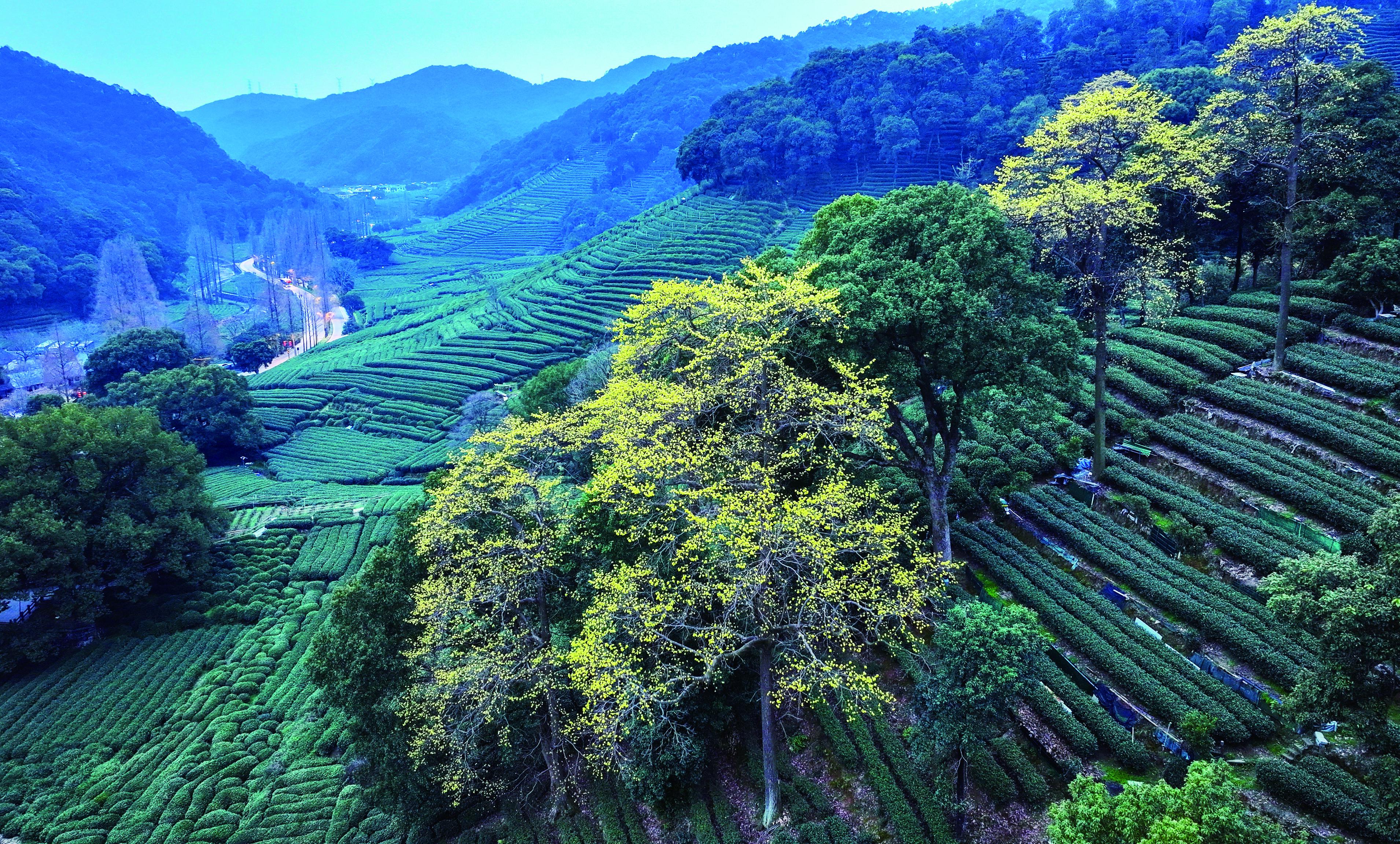 这几天,在杭州龙井村、龙坞茶镇、梅家坞等西湖龙井核心产区,檫树开花,春茶将至。昨天,在梅家坞的茶山上,西湖龙井已经悄悄萌动,长出第一茬嫩芽,色泽翠绿鲜活,而一棵棵高大的檫树迎风盛放,点点“碎金”缀满枝头,为春日的茶园增添一份绚丽生机。据悉,2026浙江新茶将于近期陆续上市,西湖龙井预计三月中旬开采上市。