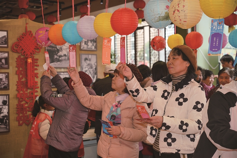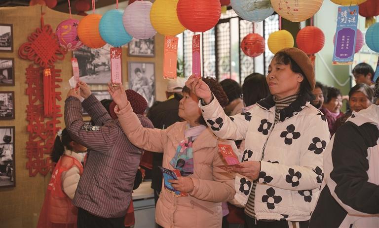 昨天下午,拱墅区上塘街道蔡马社区在蔡马大运河幸福家园开展了“‘元’气满满 马上添‘CAI’”元宵主题活动,现场张灯结彩,喜庆温馨,辖区居民齐聚一堂,热情参与“猜灯谜”“赶马入厩”“夹汤圆”等多项特色活动,在家门口乐享元宵佳节。图为昨天人们在活动现场感受热闹的元宵活动。