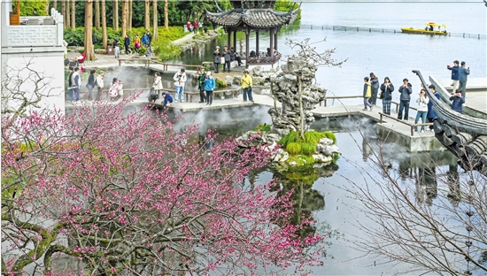 3月2日,杭州西湖曲院风荷湛碧楼前,市民游客争相拍摄一株被誉为“梅王”的古红梅。这株梅花因临水照影、清雅如画的独特姿态在社交平台刷屏。
