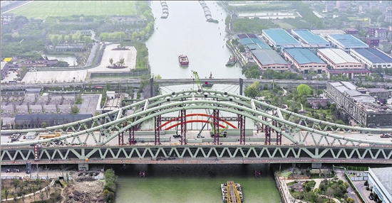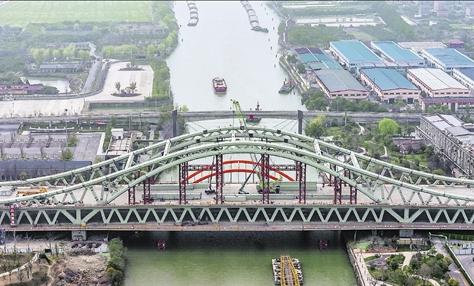 3月14日,京杭运河(余杭段)水面上,随着最后一节拱肋构件平稳吊装就位,杭州余杭区东西大道运河大桥改造工程主拱实现精准合龙。运河大桥项目全长1.01公里,主桥长300米,是浙江省首座大跨径双层钢桁架拱桥,也是杭州中环余杭段的关键控制性节点。