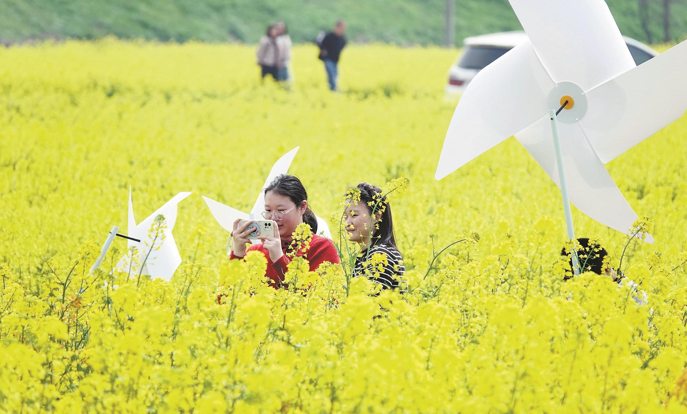 3月15日,在杭州建德更楼街道城南城市田园,600亩油菜花海正进入最佳观赏季,“城南花又开”主题花田集市欢乐开启,赏花海、拍美照、放风筝、花田音乐会等“花田+”新玩法吸引各地游客纷至沓来,共同解锁花田好春光,体验春日消费新场景。3年前,当地政府流转3个村社的连片土地打造城市田园花海,开展农业连片种植和田园运营,设置四季不同的花田主题,布局“以花为媒”的农文旅融合新业态,擘画城乡融合新图景。