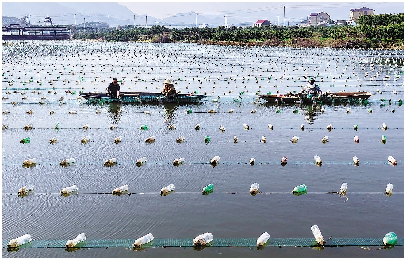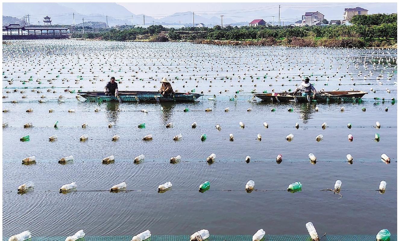 近日,在建德市三都镇春江源村的大片水塘里,村民正划着小船,往水中投放蚌苗。近年来,该村的500多亩水塘开展集约化鱼蚌混养特色养殖,在增加鱼塘立体养殖空间的同时,有效提升水体自净能力、保持水生态平衡,实现水产养殖经济效益与生态效益双赢。