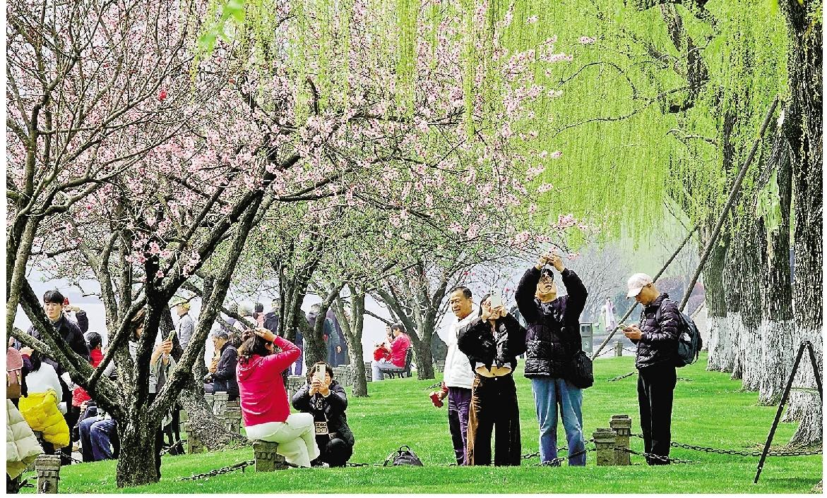 3月19日,西湖白堤上“间株杨柳间株桃”的春日经典画卷,吸引中外游客纷纷驻足打卡。