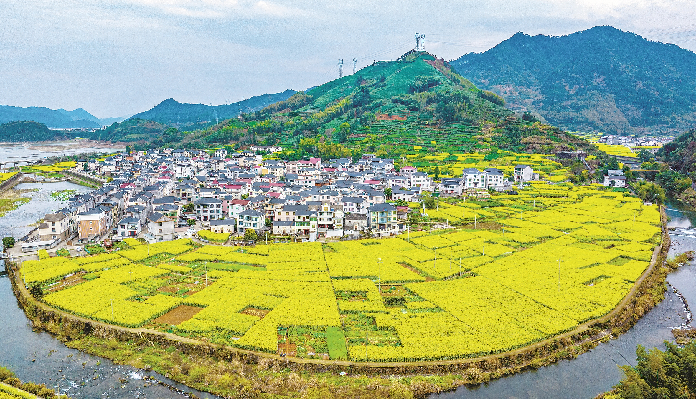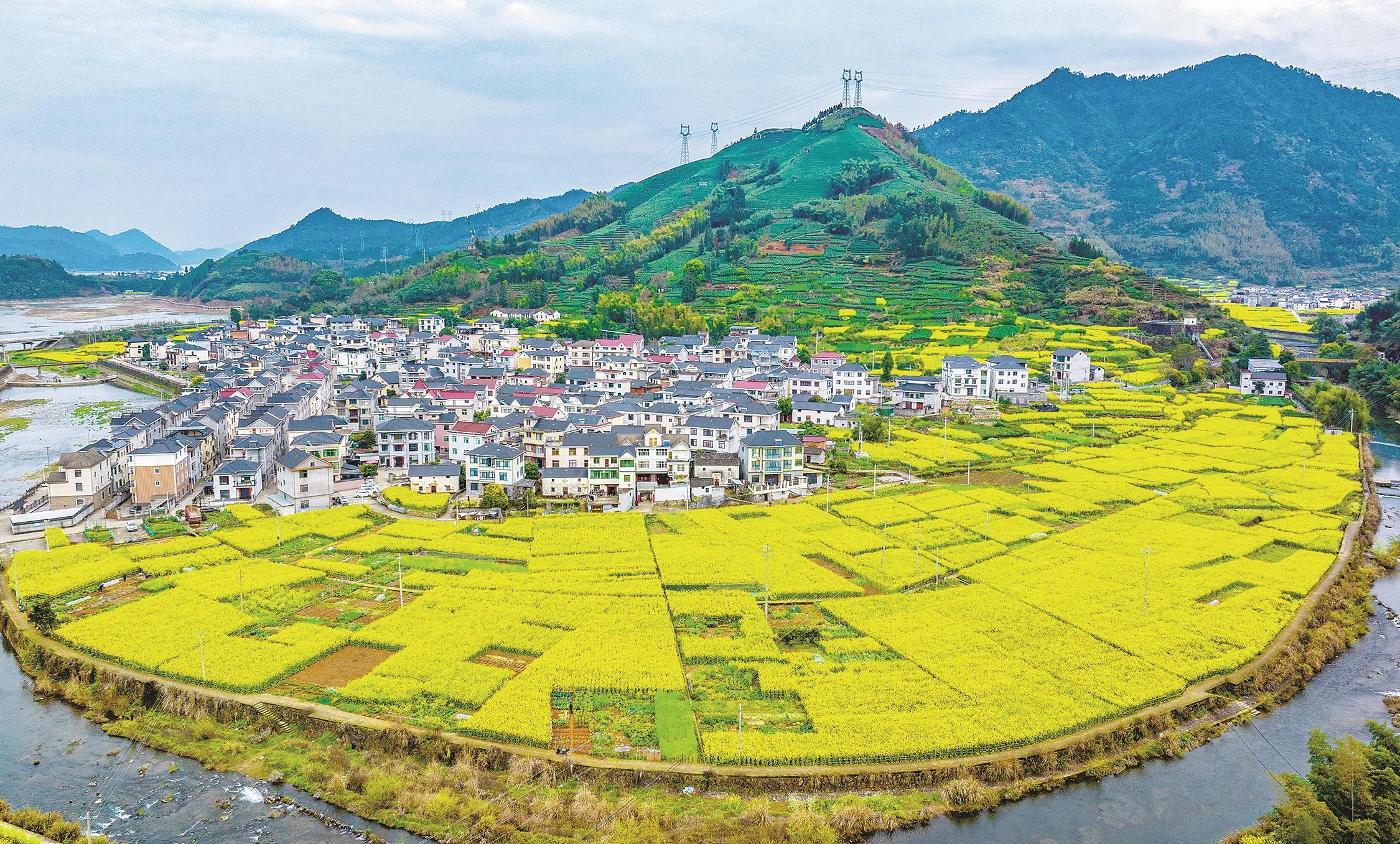 春风送暖,万物复苏,淳安县大墅镇栗月坪村的千亩油菜花正迎来盛花期,金黄的花田与白墙黛瓦的民居、潺潺流淌的溪流相映成趣;层层叠叠的白茶园绿意盎然,黛色青山环抱其间,勾勒出“茶绿花黄、山水相依”的独特景致,尽显浙西乡村的生态之美。