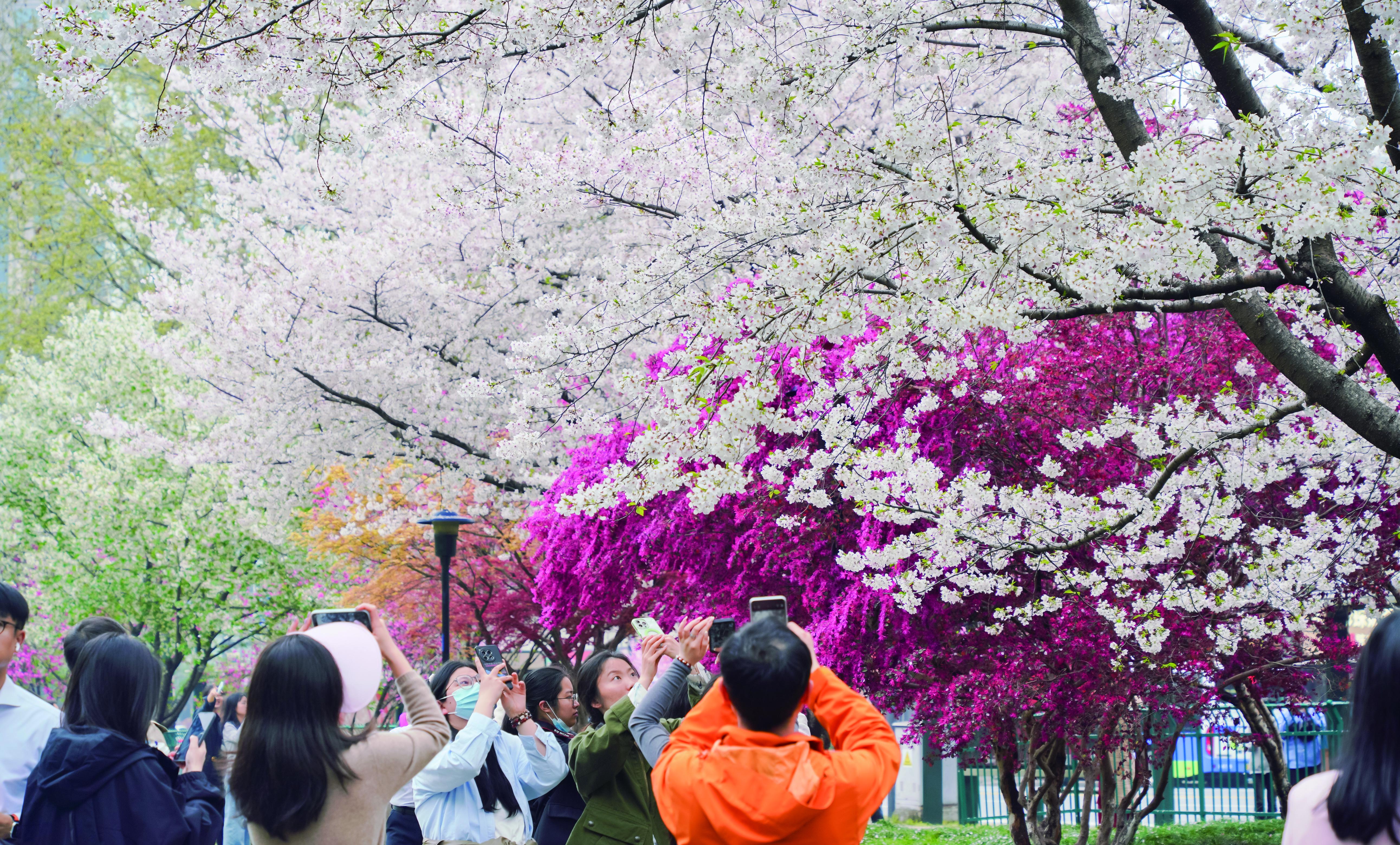 一园藏四季,武林揽芳华。这几天,拱墅区的万向公园,因其“四季同框”在社交媒体上火爆出圈。小小的公园内,樱花、美人梅、海棠、红花檵木、鸡爪槭同时绽放,绯红、粉红、橙黄、雪白交织,深浅相映,明艳动人,几乎齐聚了杭州所有的春日顶流。漫步其中,仿佛置身一场春日盛会,一步一景,满眼皆诗,让人沉醉。图为昨天,游客在万向公园内争拍旖旎春色。