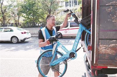 杭州日报讯 “解锁、整理、装卸。”8月12日上午11时许,手机天气软件显示体感温度上了38℃,在滨江区网商路899号,刘强和他的同事已经工作了两个小时,额头上渗满细密的汗珠,背后的衣衫也已经湿得紧贴背部,但手里仍然熟练地搬运着路边摆放不当的共享单车进行归位。