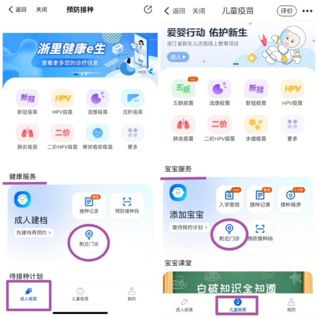 1.可在浙里办预防接种“成人疫苗”页面的“健康服务”和“儿童疫苗”页面的“宝宝服务”模块,点击“附近门诊”即可查询附近接种点;