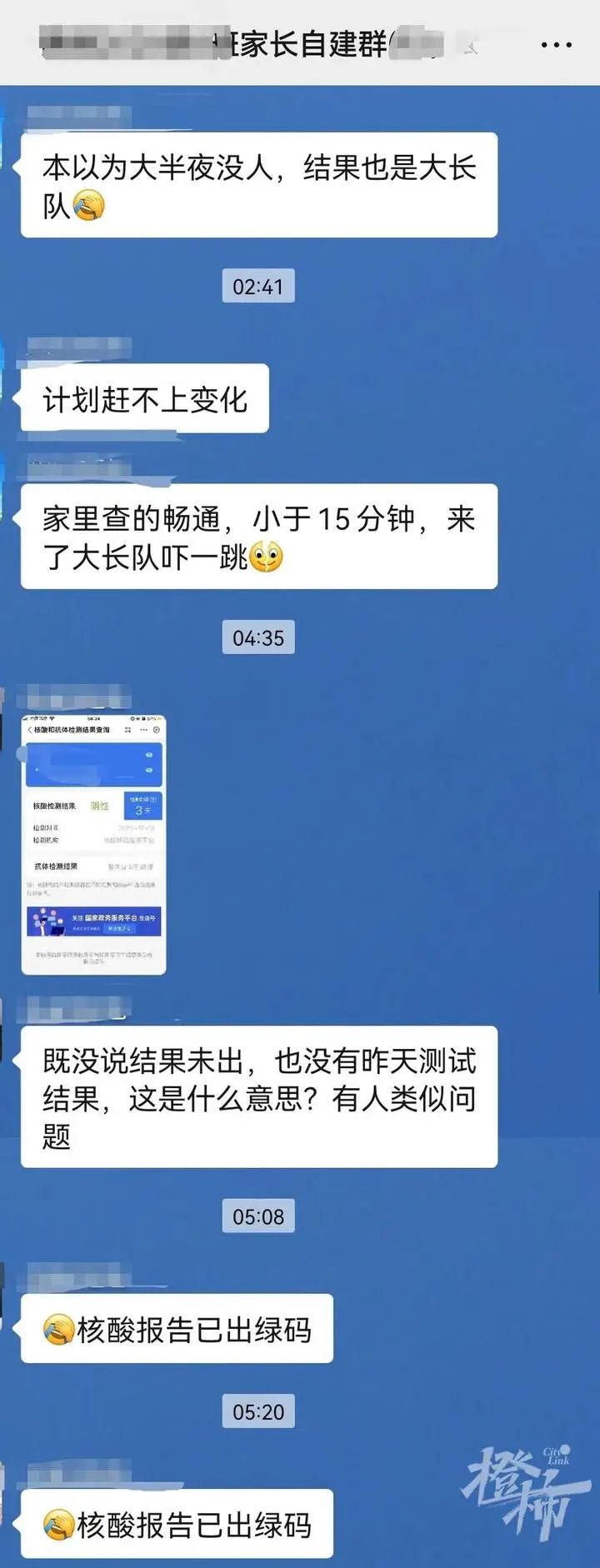 女儿的班主任一早让家长在群里接龙,说明检测情况。“昨天,我们班的同学检测都是阴性,大家都去上课了。就是昨晚等得实在太煎熬!”方女士说。