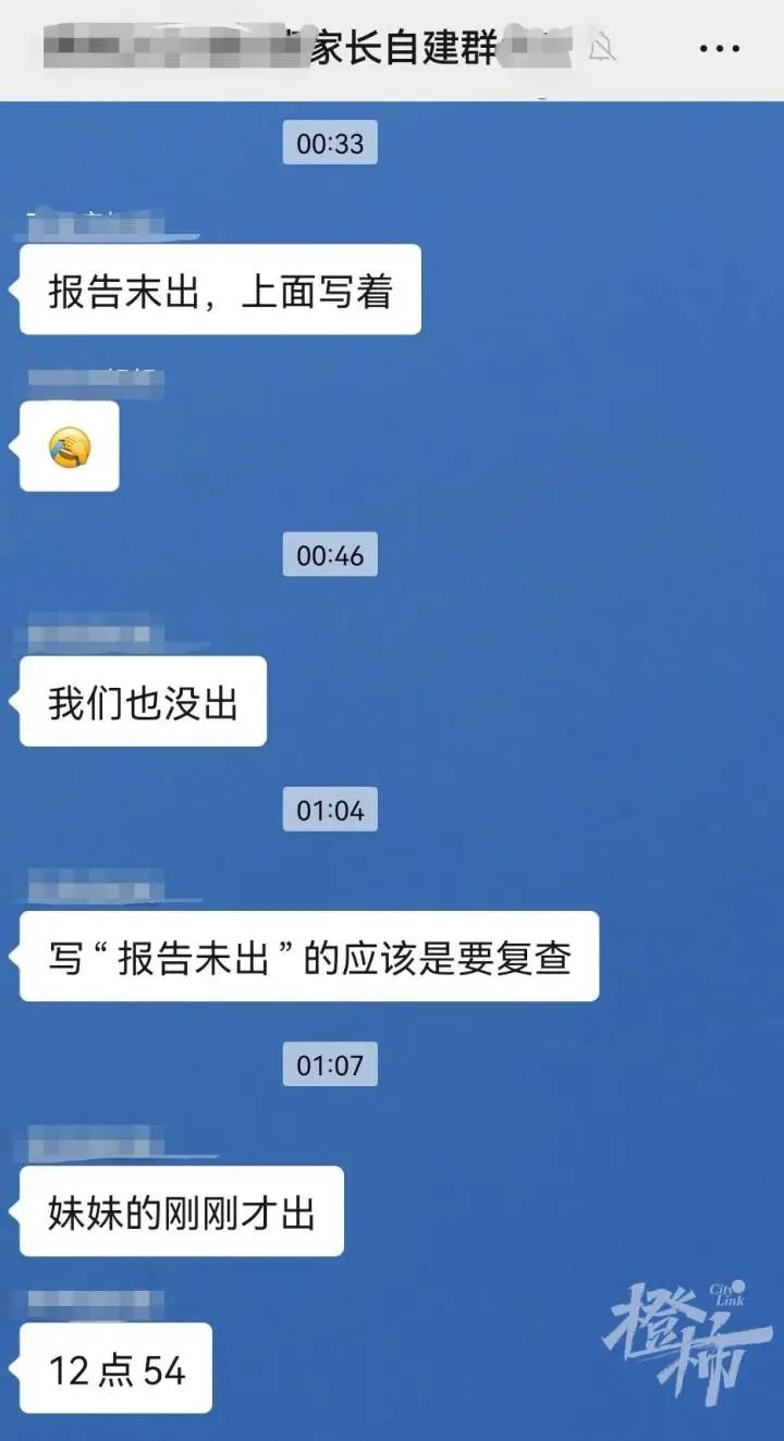 10点多,班主任再发消息询问:“有人出结果了吗?”一大批家长回复:“没有。”还有家长表示,等得有点着急。
