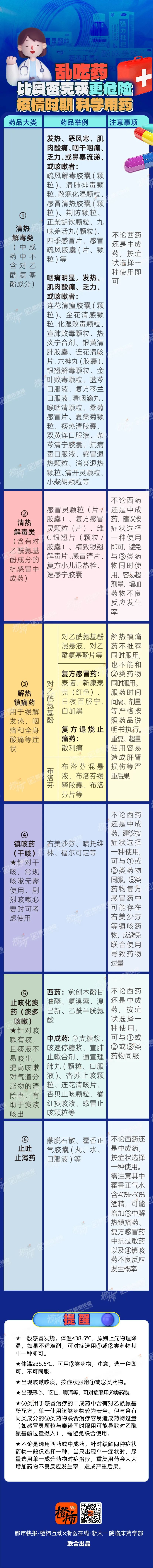 为此,都市快报联合浙大一院临床药学部,为大家制作了一张简明易懂的药品使用表,大家可以一边看表格,一边对照症状及家里的药箱,合理科学用药。