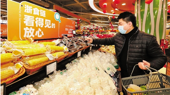 日前,顾客在宁波一家超市采购食品。有了“浙食链”,消费者扫一扫就能了解食品“从田头到餐桌”的来龙去脉。 本报记者 周旭辉 摄