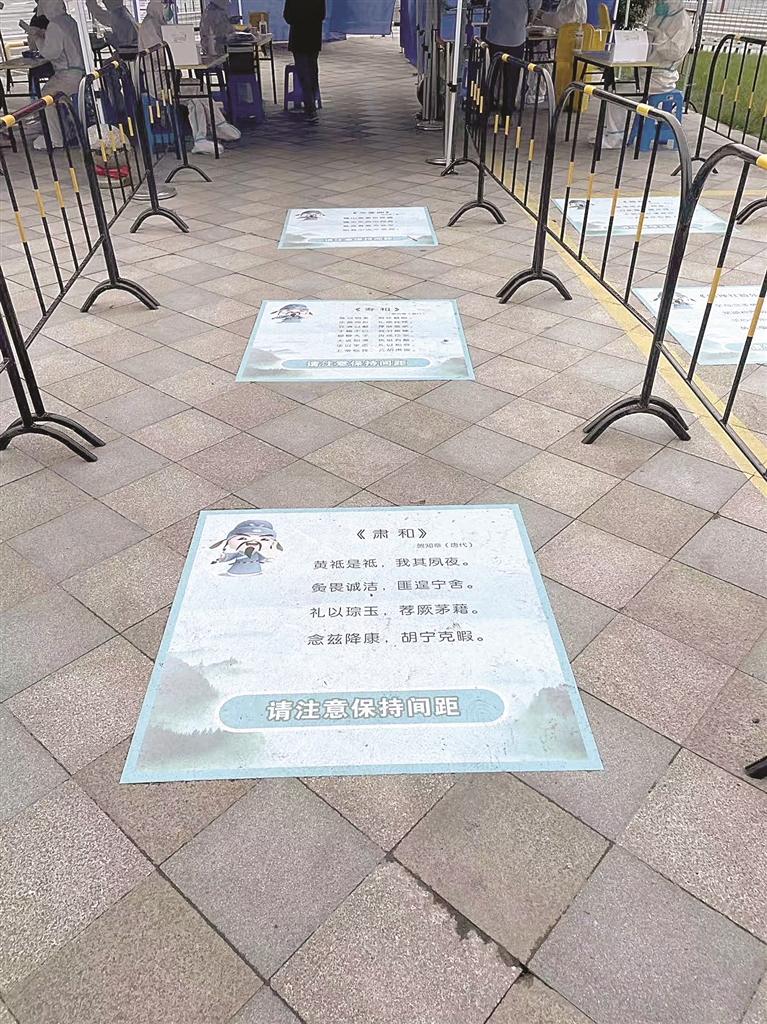 遮阳伞、脑筋急转弯、古诗词……近日,在全国各地核酸采样现场,各类创意“两米间隔线”走红。而在萧山蜀山街道朝阳银座核酸采样点,地面上的两米间隔线,被换成了蜀山第一文化IP贺知章的古诗作品。贺知章的诗向以清新通俗著称,用来进行文化普及非常合适。在排队的同时,还能让市民们了解本地文化,对于缓解排队焦虑和提升贺知章文化知名度都有作用,可以说是双赢了。