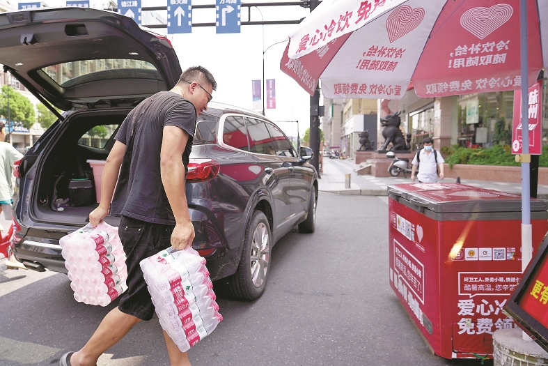 昨天下午3点多,临安锦城街道万华广场上,气温38℃。一把红白相间的遮阳伞下,一台被包装成红色的冰柜,竟成了不少外卖小哥的送餐目的地。很快,冰柜的门关不严实了,斜斜地翘起了30度左右,冰柜两旁也堆满了市民送来的成箱的饮料。守着冰柜的工作人员不得不忙活起来,整理大家送来的一份份心意——矿泉水、可乐、奶茶、西瓜、棒冰……