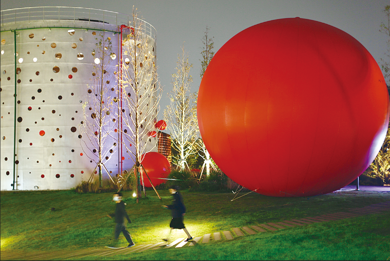 从小河公园草坪走进大油罐,沿路会遇到各种姿态的红球。许多人自发地参与了这场大型“行为艺术”,用照片把这份热烈的红色传递出去。