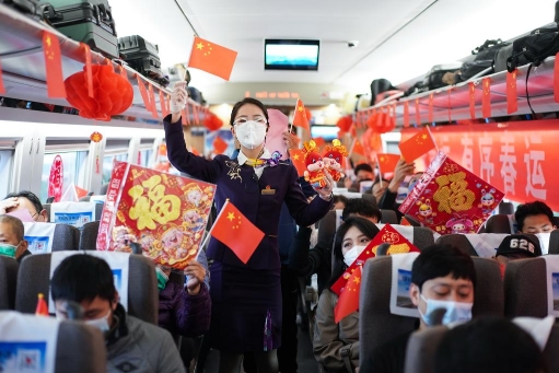 1月9日,在D2281次列车上的旅客和乘务员。新华社记者 季春鹏 摄