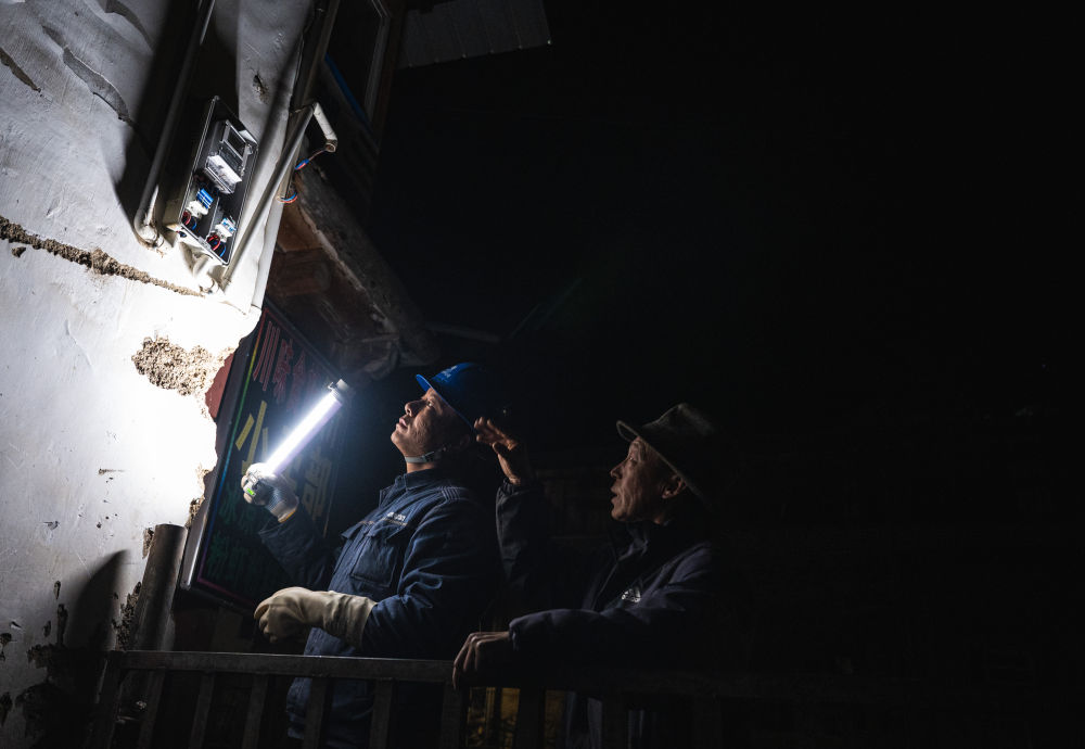 2023年1月9日,旺登在雨崩村检修电路。新华社记者曹梦瑶 摄