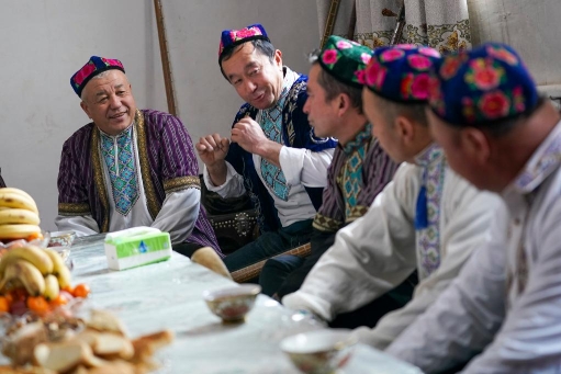 61岁的苏来曼是自治区级非物质文化遗产传承人,也是鲁克沁镇木卡姆传承中心的一名队员。走进他的家中,一群头戴花帽的木卡姆艺人正在排练,悠扬的乐声、激昂的手鼓、欢快的歌舞引来村民不时驻足。