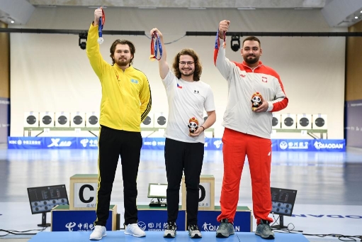 男子25米手枪速射冠军捷克选手拉姆普拉(中)在颁奖仪式上。新华社记者曹祎铭摄