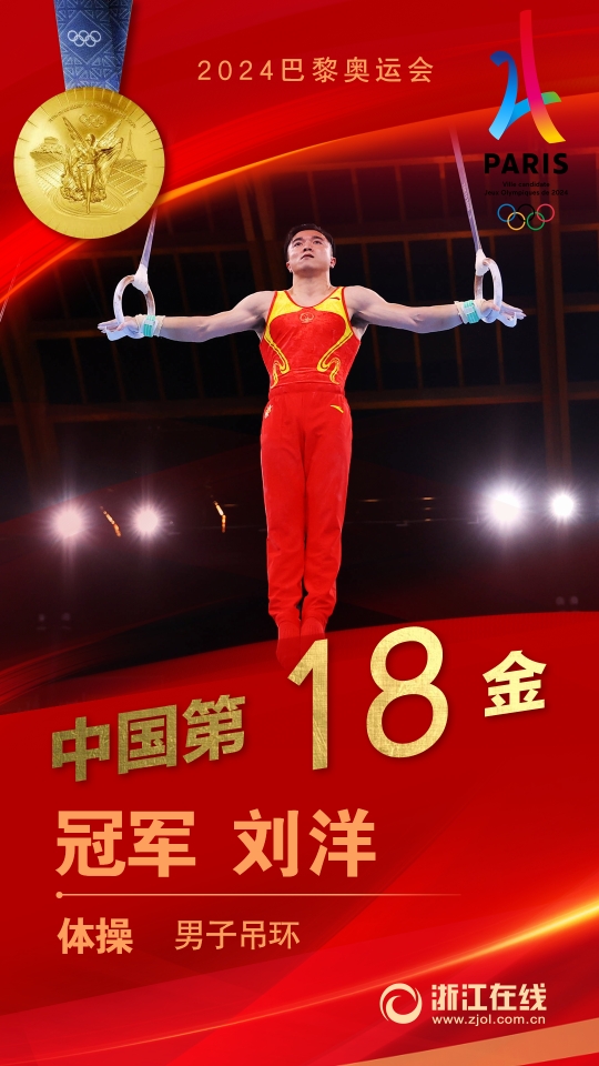随后,9点31分左右在体操男子吊环比赛中,刘洋夺得冠军,邹敬园获得亚军。