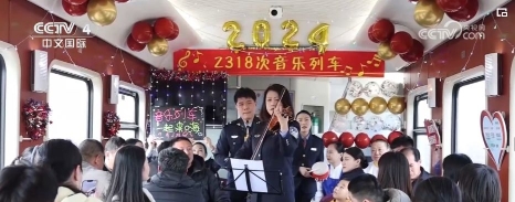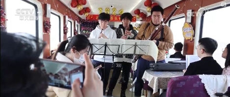 随着春节临近,在外务工的游子们纷纷踏上了回家的旅途。在青岛北开往成都西Z318次列车上,悦耳欢快旋律响起,列车工作人员邀请3位学生旅客,为大家演奏了悠扬欢快的乐曲。
