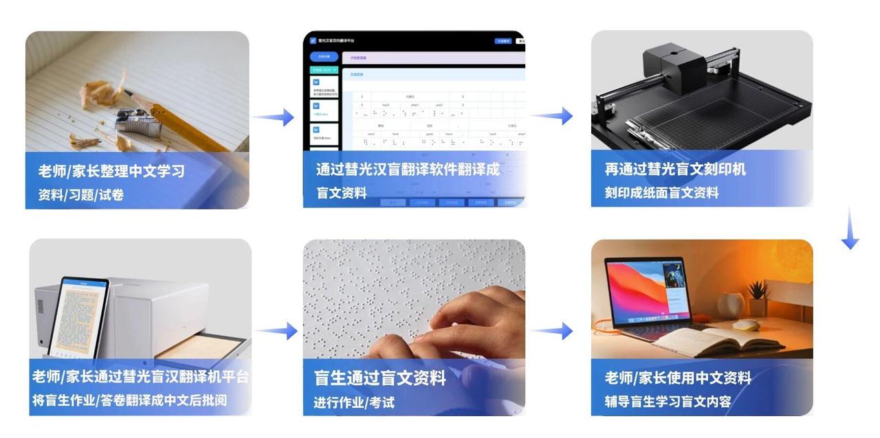 作为专注于助盲普惠教育的科技企业,彗光科技带来的“软件+硬件”革新打破了这一窘境。团队研发的彗光汉盲双向翻译平台,不仅填补了国内“多模态盲文翻译”的空白,更在全球范围内首创“纸面盲文反向转写”功能。