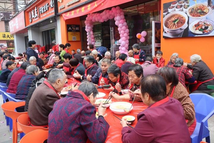 “邵师傅牛杂煲”店老板娘徐慧英做东,106位老人围坐一堂,边吃边闲聊家常,年龄最大的已经90岁。