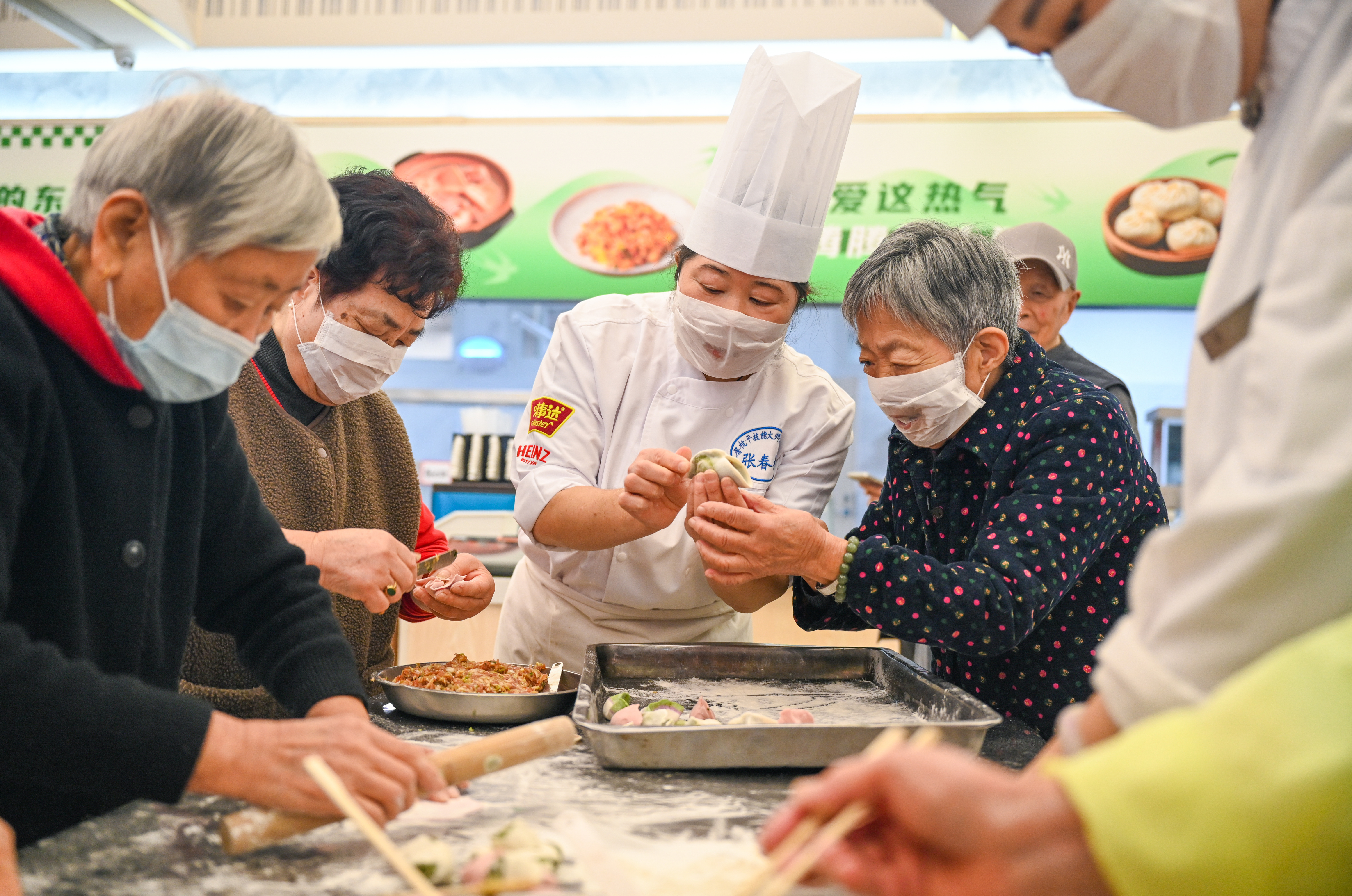 最受休养员欢迎的,莫过于互动包制彩虹水饺的活动。大家围坐一桌,在劳模工匠的带领下,一边包着色彩斑斓的水饺,一边闲话家常,欢声笑语不绝于耳。知味观味庄点心厨师长、浙江省金蓝领张春梅向休养员们介绍了其中的巧思:“这些五彩斑斓的饺子,每一抹颜色都源自天然食材——绿色的菠菜、金色的南瓜、紫色的紫薯与红色的红曲米。”这匠心融入的缤纷色彩,正寓意着休养员们的晚年生活能如夕阳般绚烂多彩。