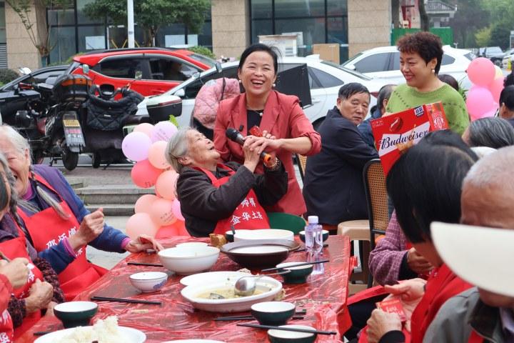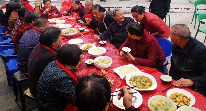 重阳节前,杭州三墩镇厚仁商业街上,一场百人重阳宴如约而至。