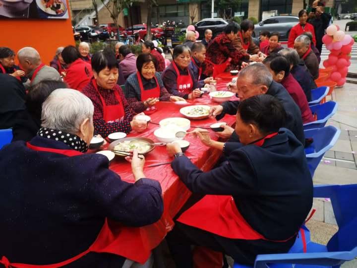 “邵师傅牛杂煲”店老板娘徐慧英做东,106位老人围坐一堂,边吃边闲聊家常,年龄最大的已经90岁。